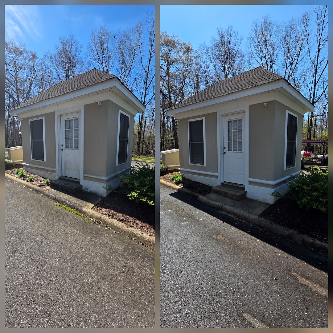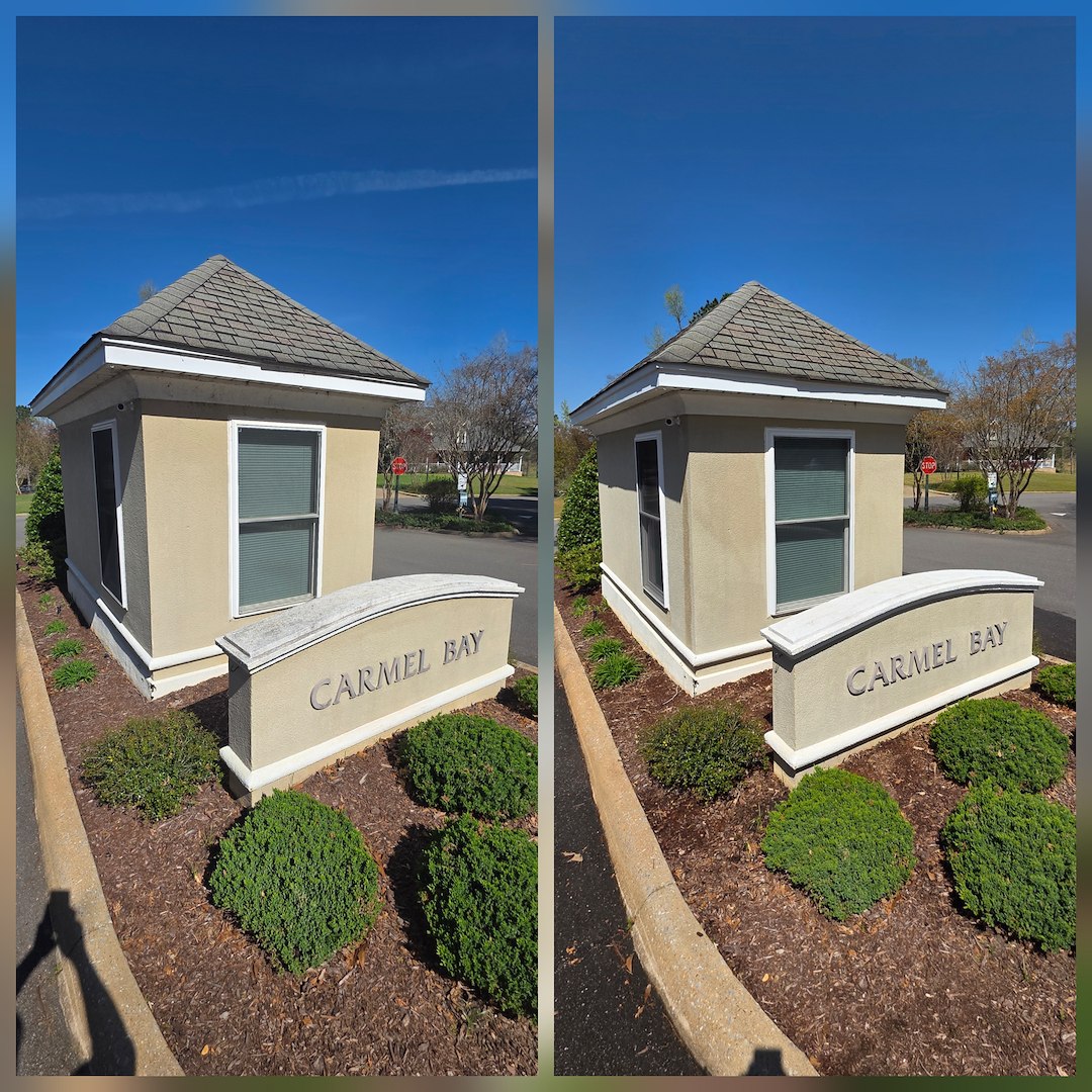 The work focused on the main neighborhood signs and the guard house at the community entrance. We completed a full soft wash of those exterior surfaces to address accumulated dirt, pollen, and other common contaminants that make signs and entry structures look tired.