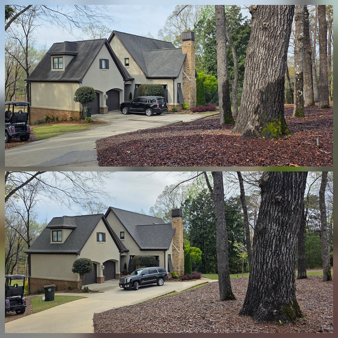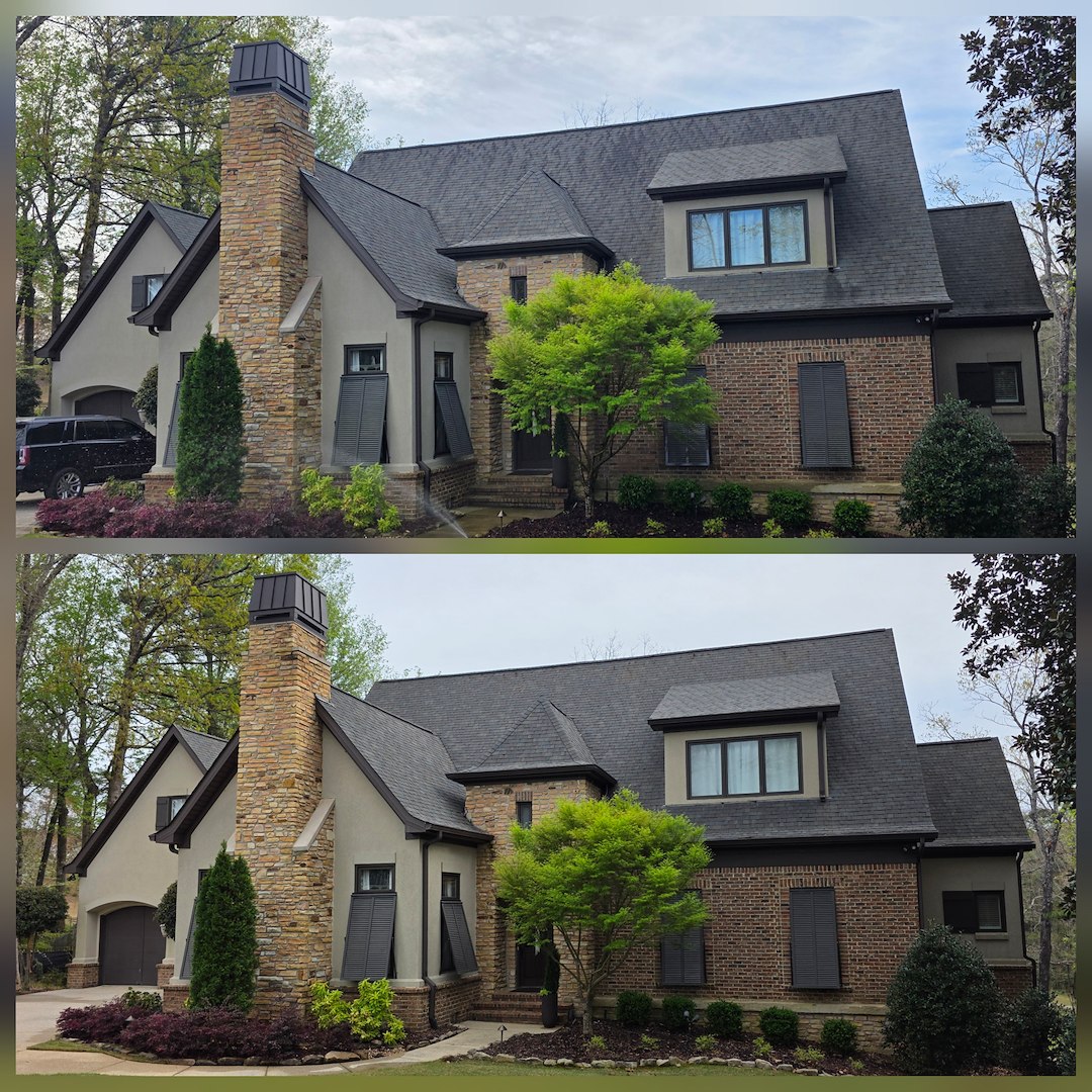 On the day of the project our crew arrived in Tuscaloosa prepared to work safely and efficiently. We set up containment and protection for plants and outdoor fixtures around the house, and we took care to avoid tracking any runoff into the yard. For the roof we used our low pressure roof cleaning method to remove algae, moss, and surface soiling, following the approach the homeowner requested. That method reduces the risk of damage to shingles while addressing the buildup on the roof surface.