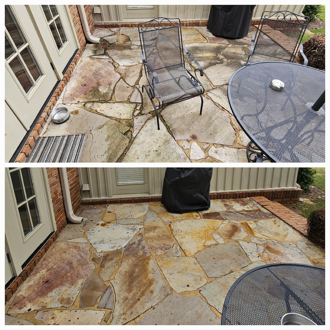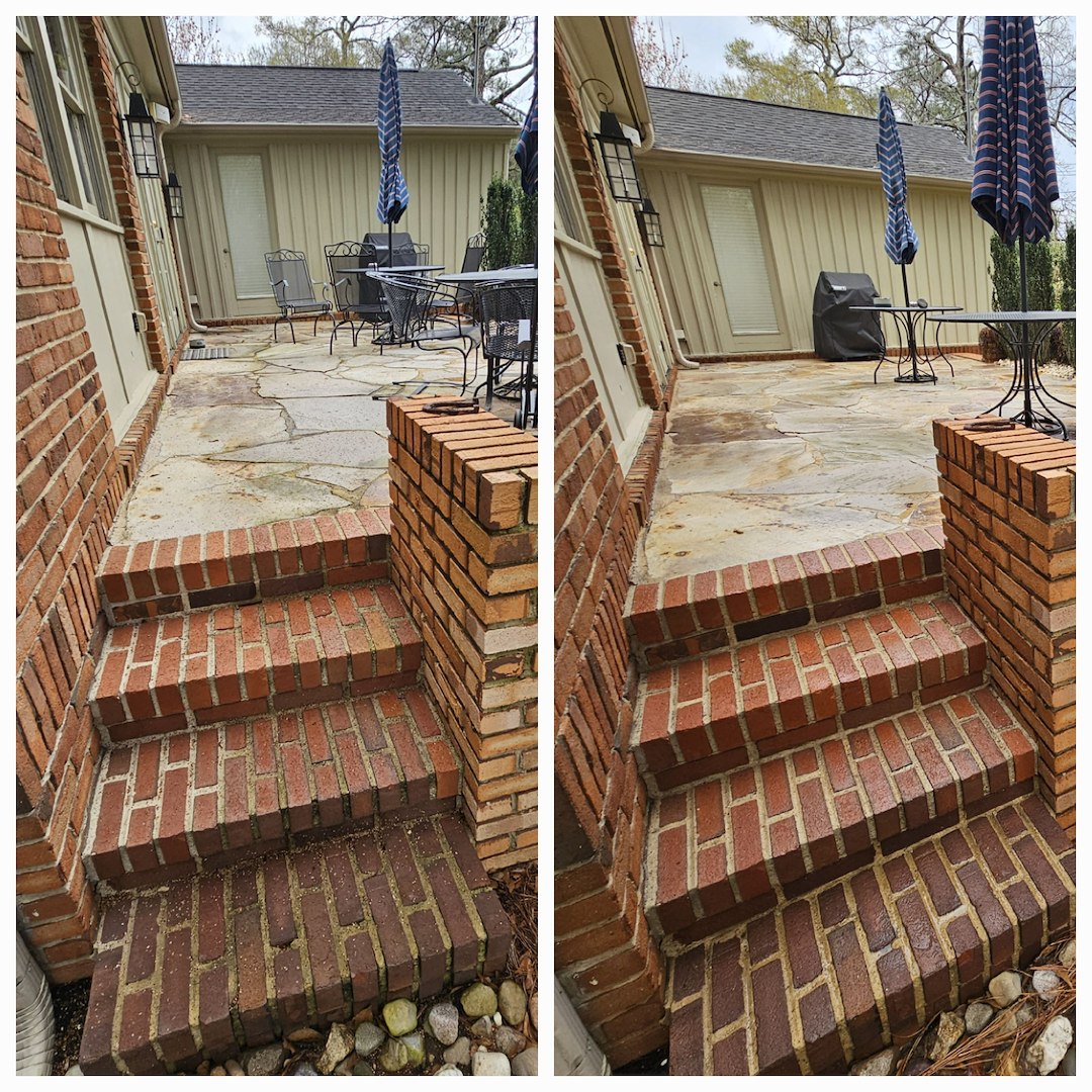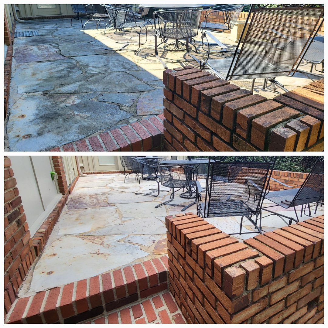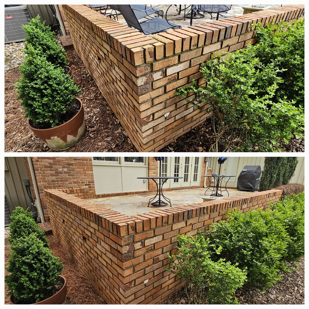 This customer in Tuscaloosa, AL has been a repeat customer for the last 5 years. Every year he calls on us to provide soft washing services for his delicate stone patio, antique brick work, and his concrete carport. The customer likes the fact that we don't use high pressure to clean the aging mortar and that we know that not everything can be cleaned with bleach. This is the case with the delicate stone work within his patio.