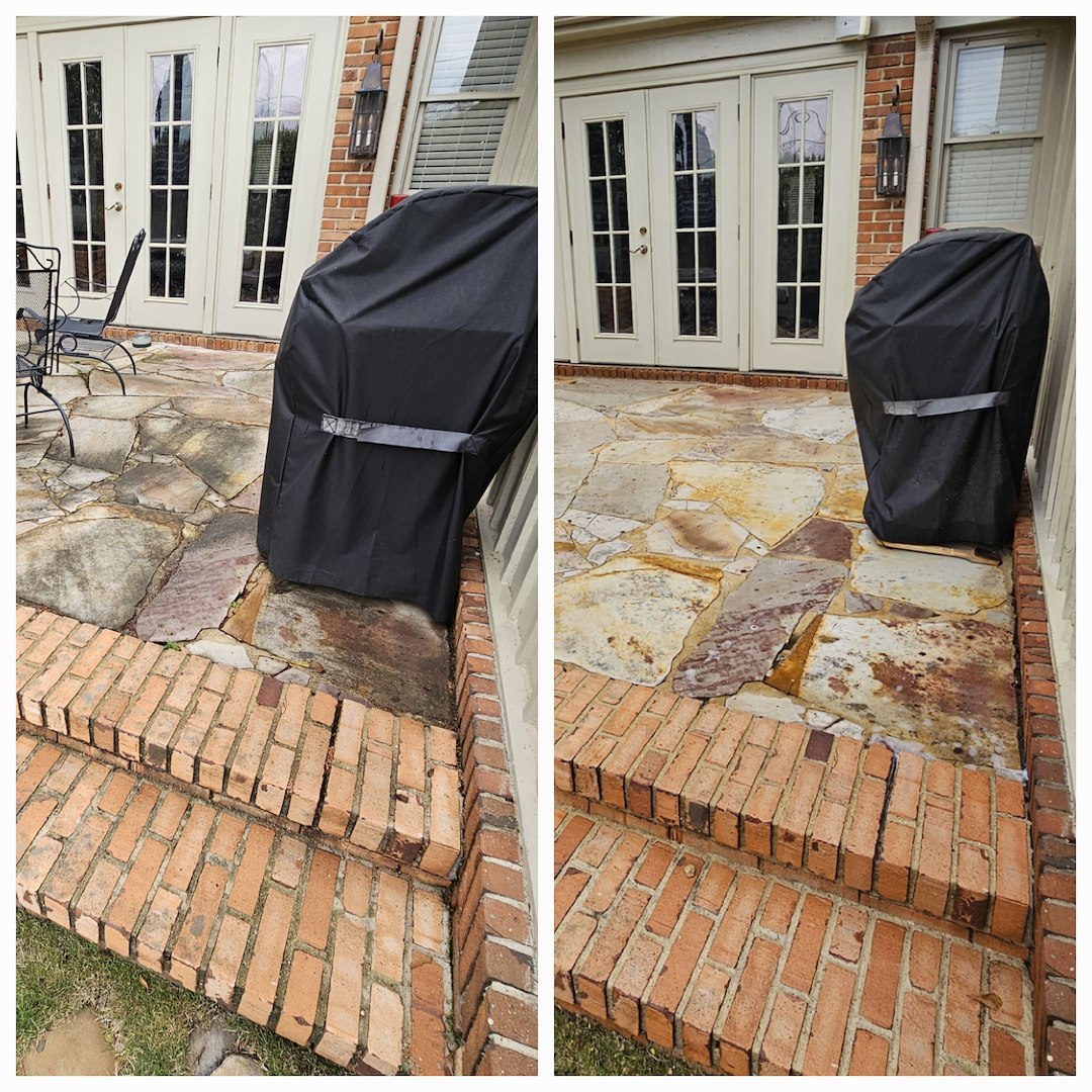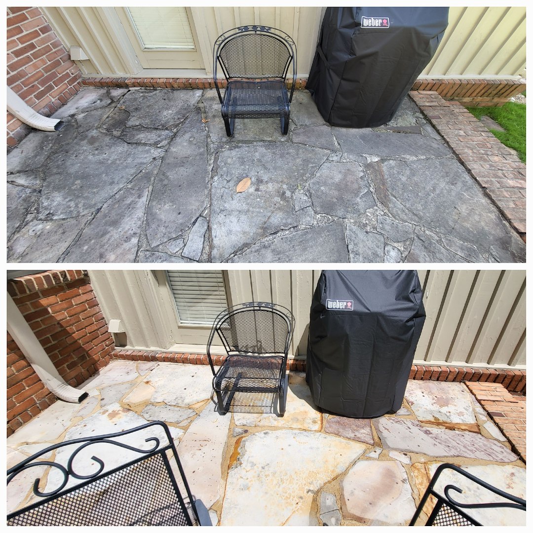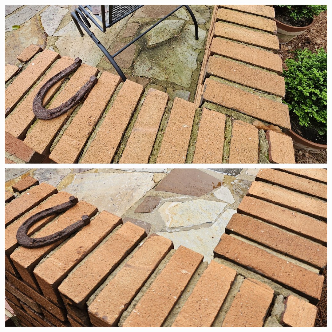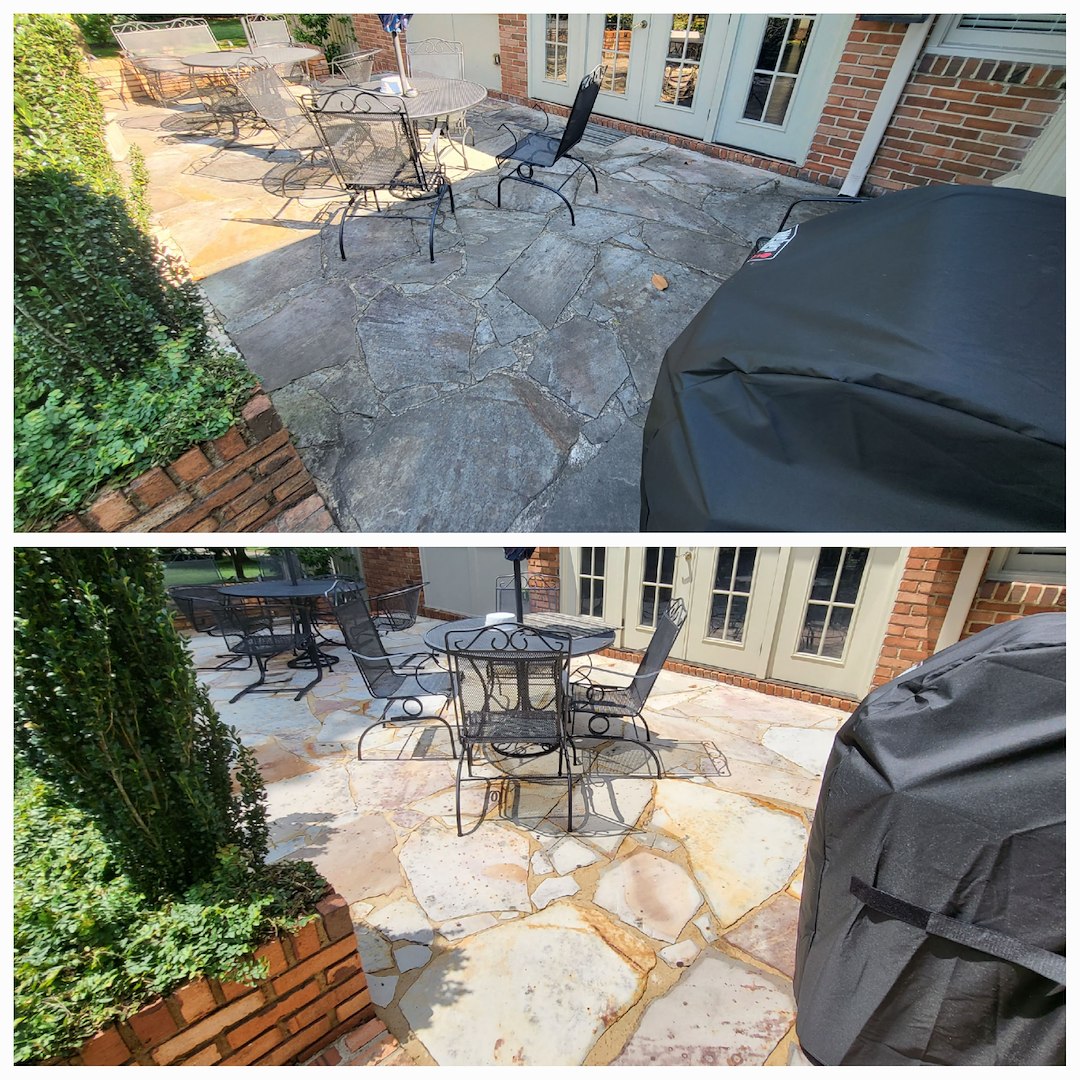 This customer in Tuscaloosa, AL has been a repeat customer for the last 5 years. Every year he calls on us to provide soft washing services for his delicate stone patio, antique brick work, and his concrete carport. The customer likes the fact that we don't use high pressure to clean the aging mortar and that we know that not everything can be cleaned with bleach. This is the case with the delicate stone work within his patio.