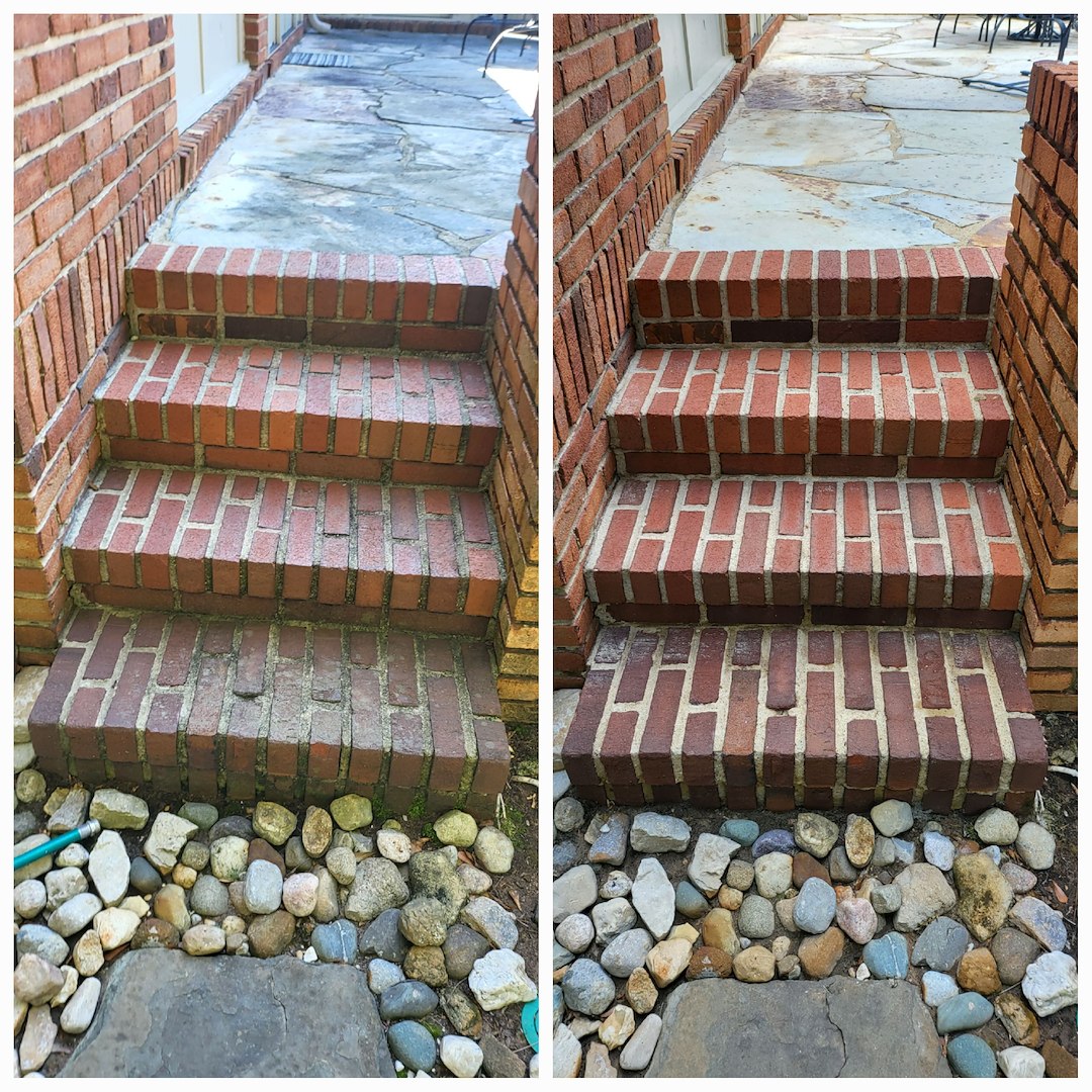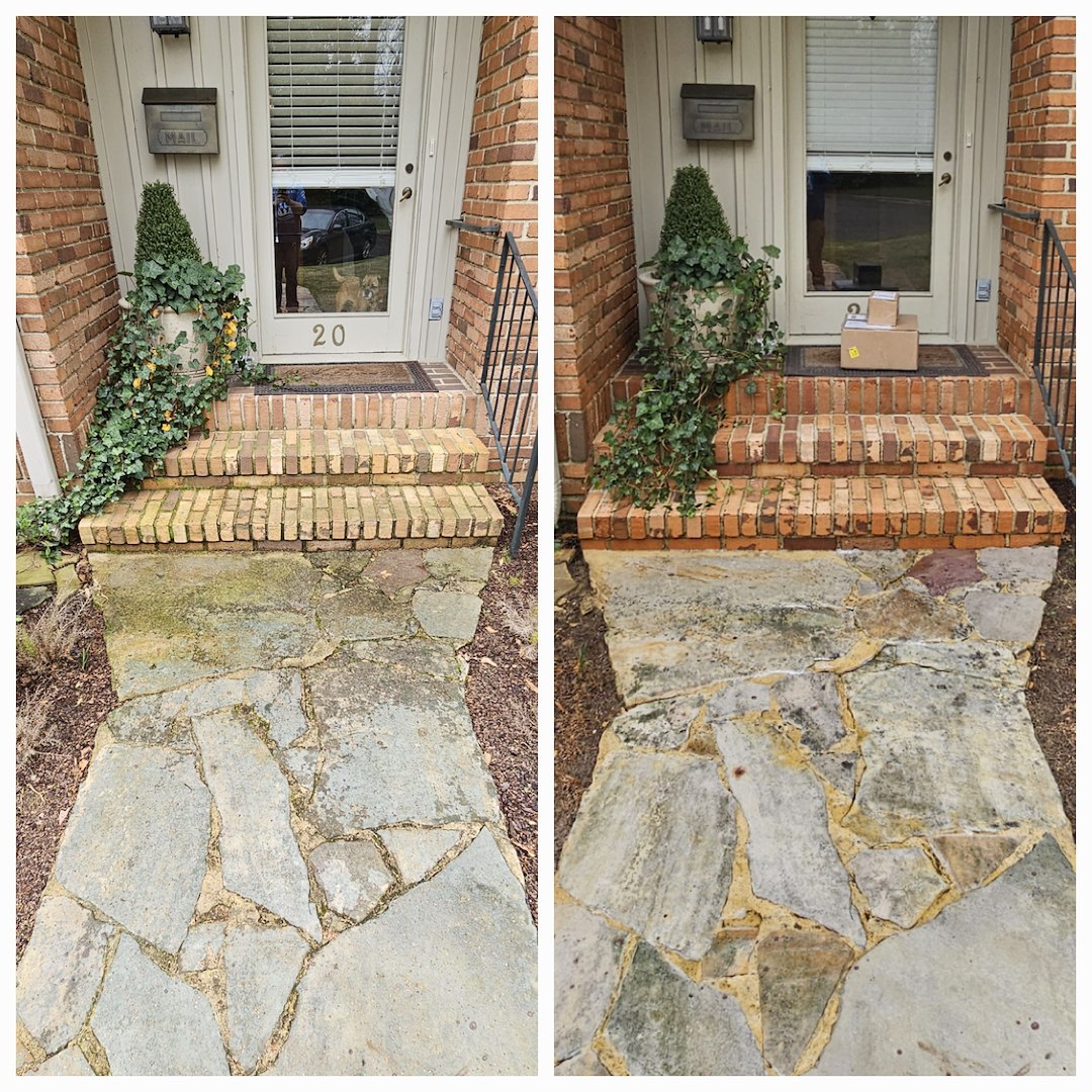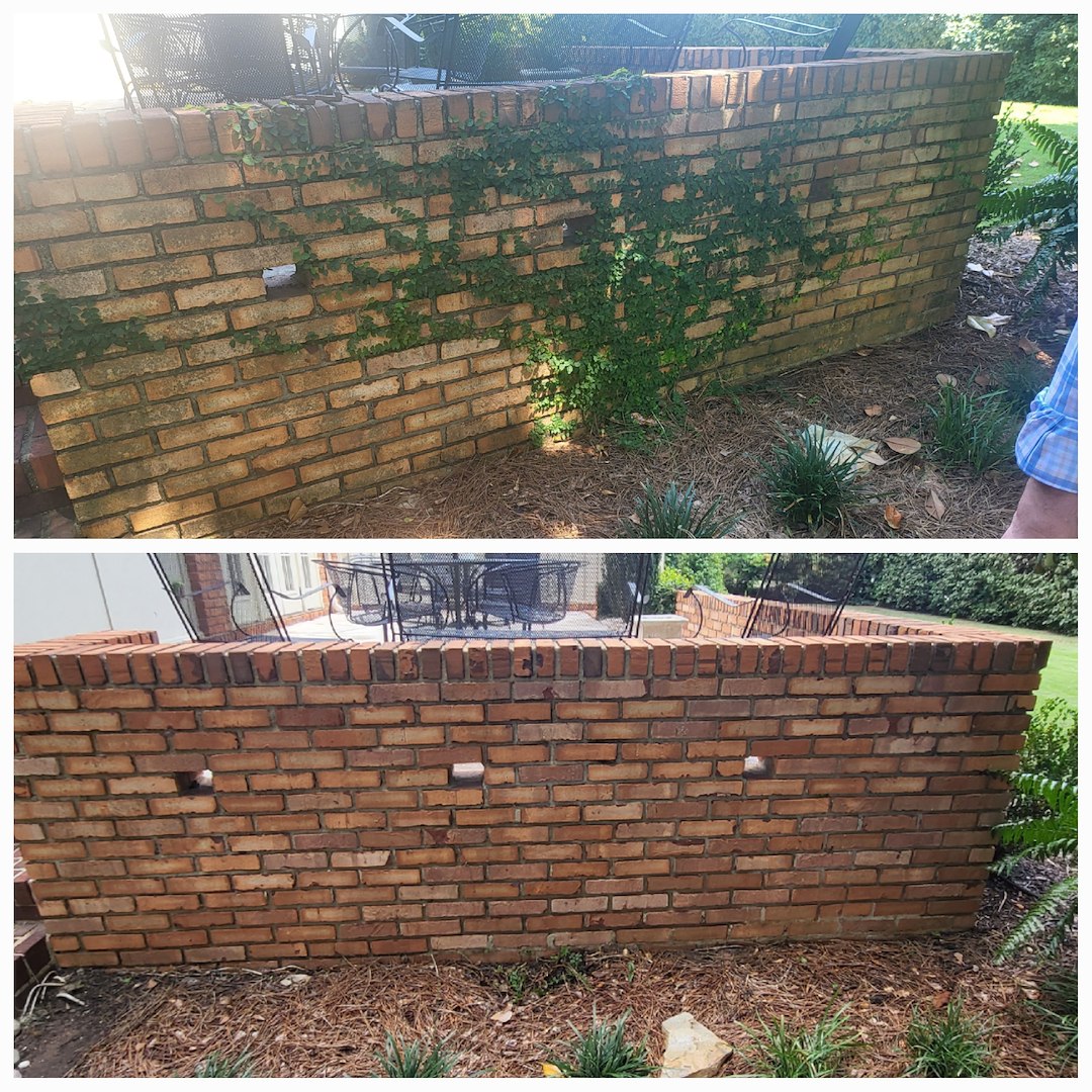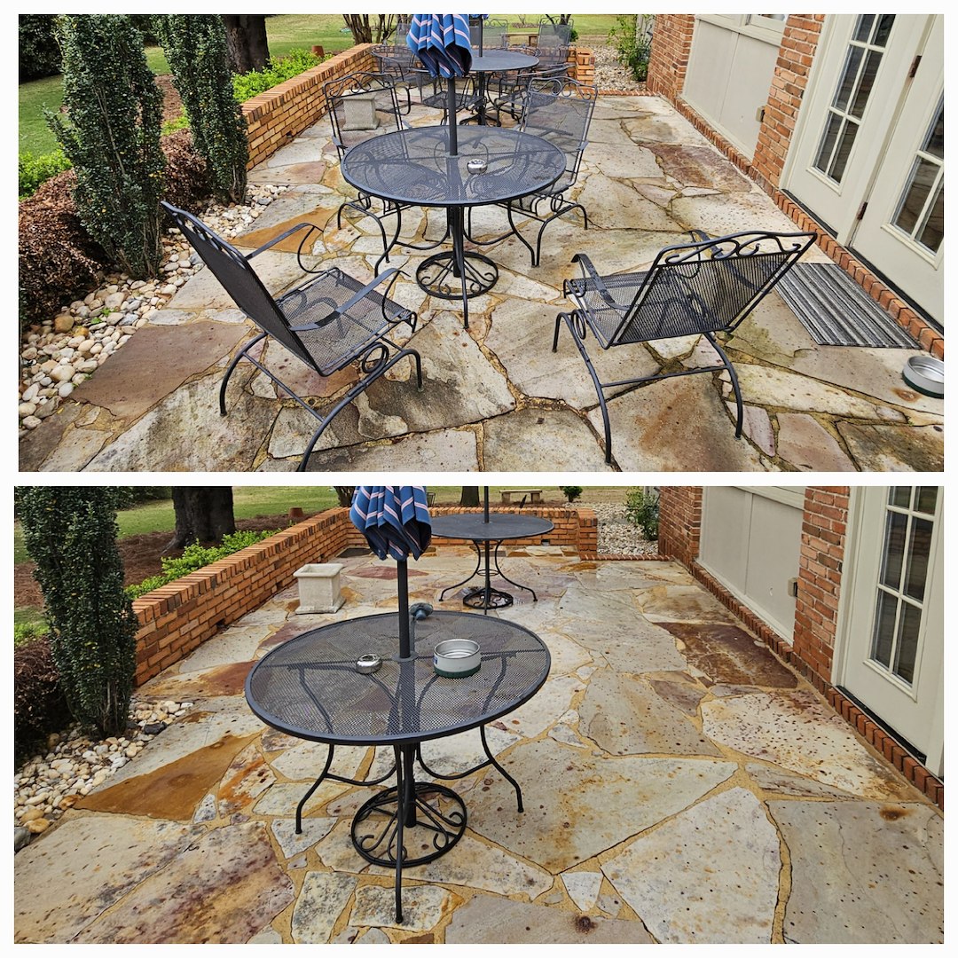 This customer in Tuscaloosa, AL has been a repeat customer for the last 5 years. Every year he calls on us to provide soft washing services for his delicate stone patio, antique brick work, and his concrete carport. The customer likes the fact that we don't use high pressure to clean the aging mortar and that we know that not everything can be cleaned with bleach. This is the case with the delicate stone work within his patio.