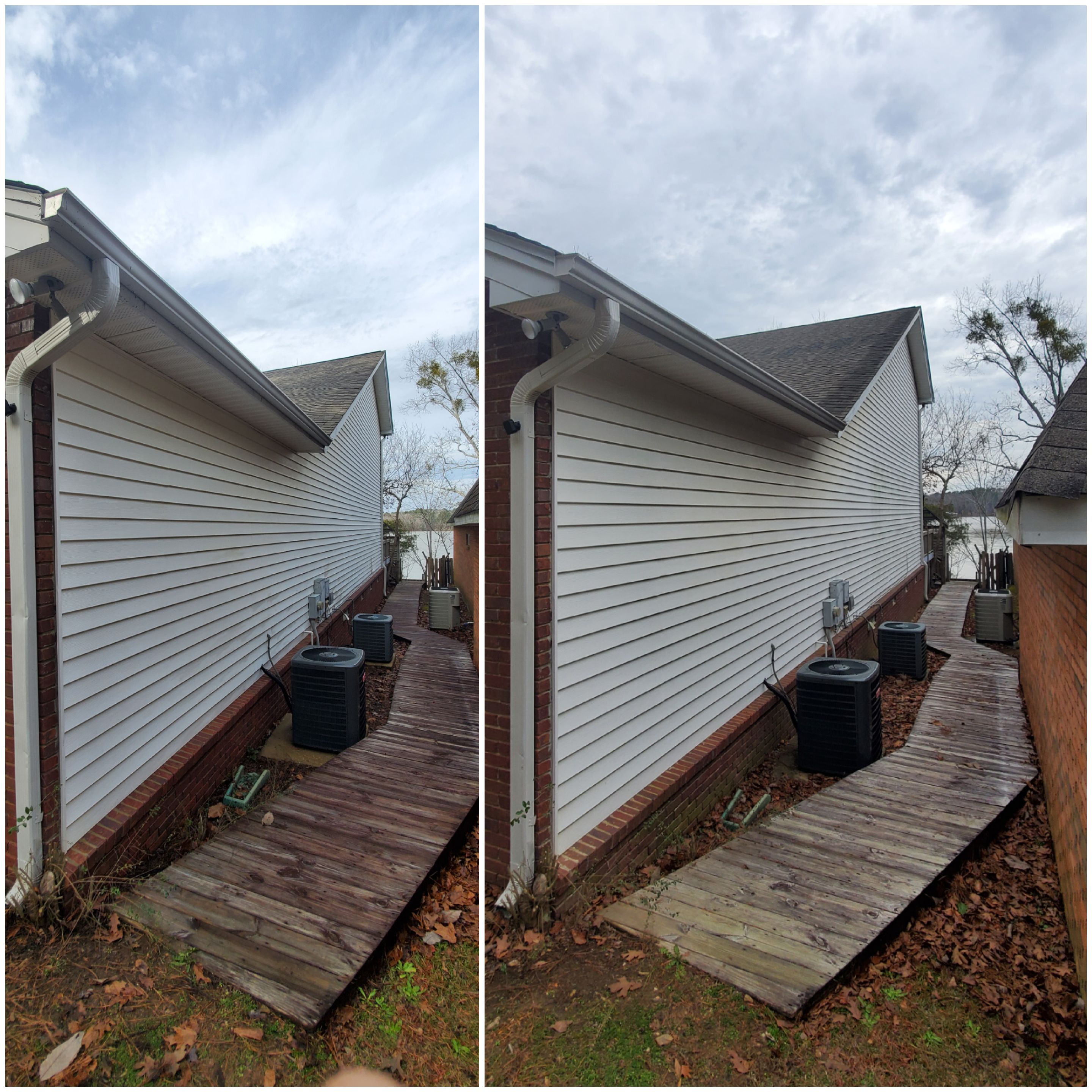 This concrete cleaning and house washing in Hoover, AL was a simple half-day project the homeowner wanted to get completed prior to the 4th of July weekend. The concrete driveway had become dirty from dirt and grime buildup. The vinyl on the home was starting to really show the algae that was growing and spreading on the shady sides of the home. The customer initially hired us to clean just the concrete and the vinyl, but ended up adding in a wood walkway and a window cleaning.