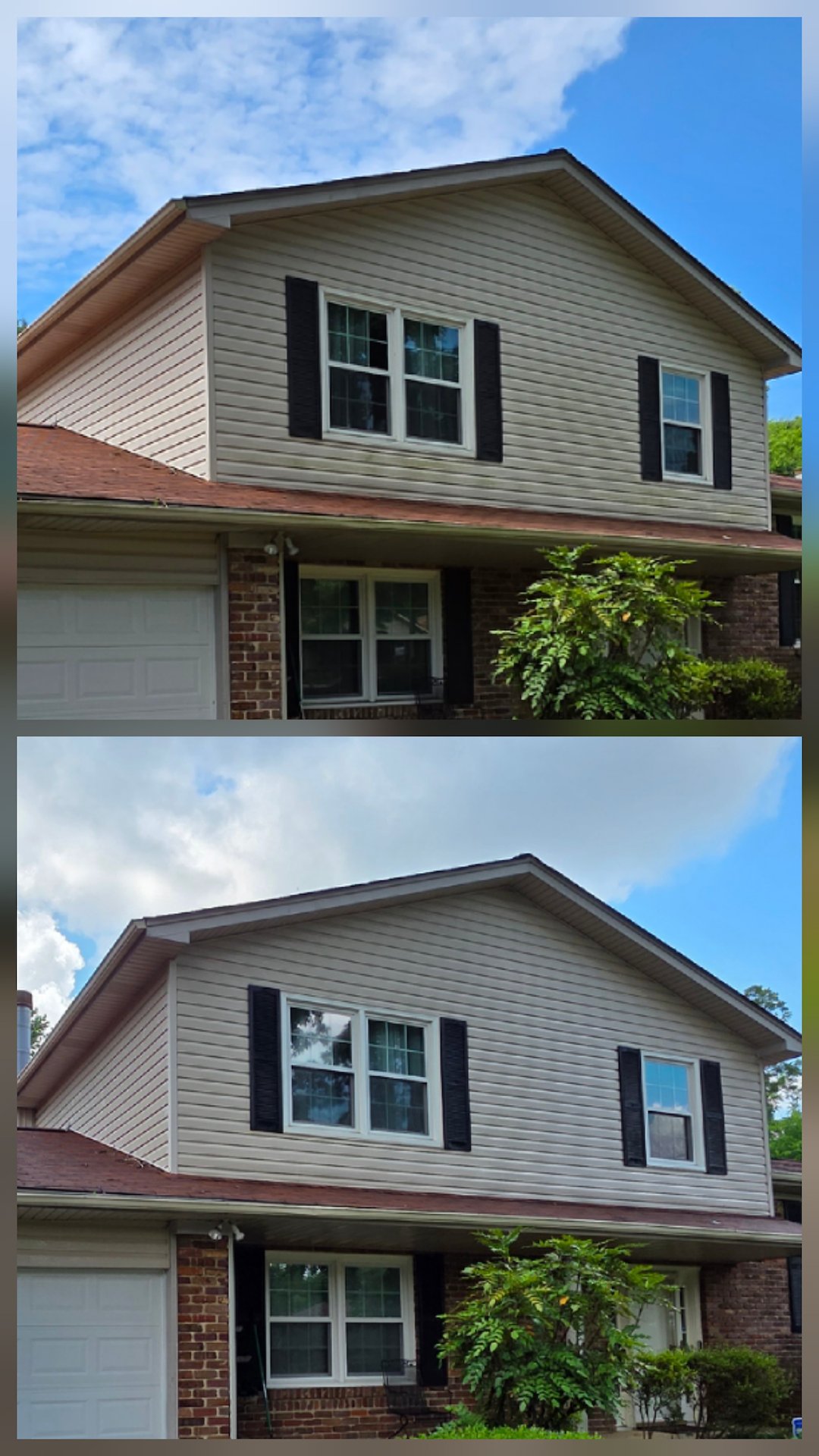 After arriving onsite, we quickly went to work prepping the area to be cleaned. Starting from the bottom and moving up, we applied the house wash solution using our low pressure soft washing system. After allowing the solution to dwell for the appropriate amount of time, we began the washing portion by rinsing the entire home from the top down to the ground. All of the algae and mildew buildup washed away effortlessly, and the home looked new again.
