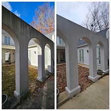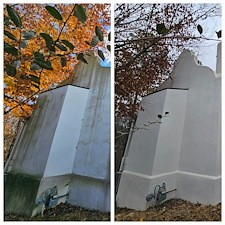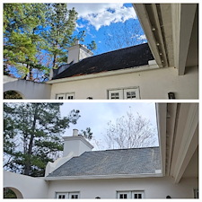 This was a fairly large project for a customer who had inherited his father's home upon his passing. The Vestavia Hills, AL home was being put on the market and the customer wanted to have it cleaned up on the outside and presentable for potential buyers. The home's stucco exterior needed a low pressure soft washing to rid the home of the green and black algae that had been growing on the exterior surfaces. in addition, the customer also wanted to have the driveway and curbs cleaned to top it all off. upon our initial inspection of everything that needed to be cleaned, we noticed an area of the roof that needed some attention due to it showing signs of minimal moss growth. the customer decided to add in that portion of the roof to prevent the future owners from any unforeseen rotting issues underneath the shingles in the near future.
